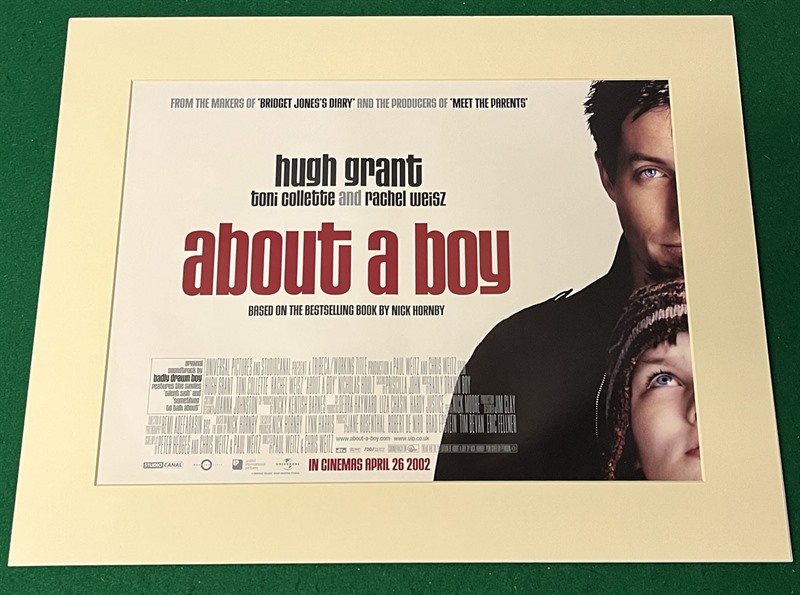 Original UK mini-Quad poster (12"x 16") card mounted (15 3/4"x 19 3/4") ready to frame for the rom-com starring Hugh Grant, Rachel Weisz & Nicholas Hoult "About A Boy" (2002).