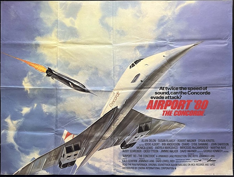 A film from the "Disaster" genre of movies which became popular in the 1970's (Towering Inferno" etc). Like others in this category, this film boasted a smattering of big stars but like so many films, arguably the best thing about this one was the great poster design. Here we have a fantastic illustration of the elegant Concorde about to be impacted by a missile. A dramatic piece of poster illustration but the artist is unknown.