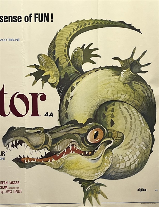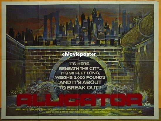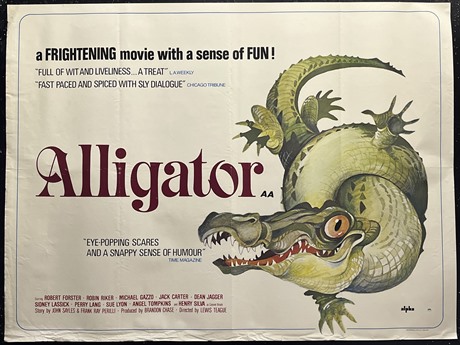 UK Quad Style-A cinema poster for the American B-movie horrior film "The Alligator" (1980).An interesting semi-humorous caricature illustration of the dreaded beast, this & the Style-B Quad (image shown courtesy of emovieposter) were both by the British artist,