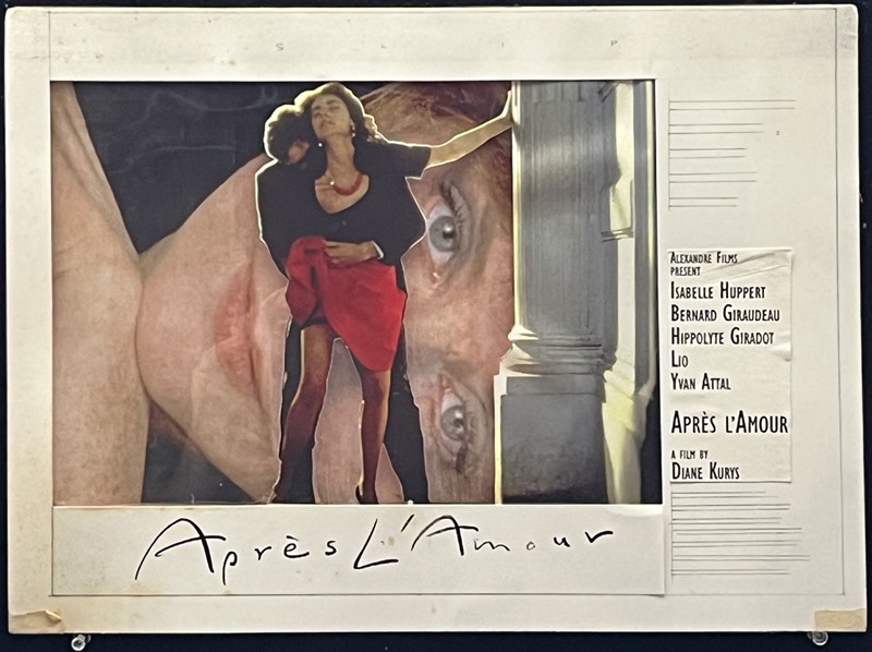 The concept features a background photo of Ms Huppert's face with an acetate overlay, two photo prints superimposed on top & printed text etc on the card mount, all affixed to polyboard. This was one of several designs Fair created for this film, the others being sold previously.