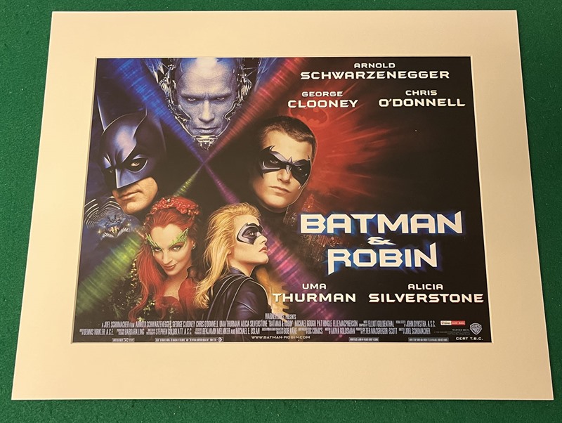 Original UK mini-Quad poster (12"x 16") card mounted (15 3/4"x 19 3/4") ready to frame for "Batman and Robin" (1997) the star-studded re-boot of the "Batman" franchise, this film starring George Clooney, Chris O'Donnell, Uma Thurman & Arnold Schwarzenegger as the "baddie".