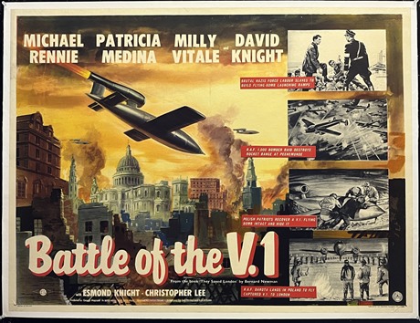 Scarce linen-backed UK Quad cinema poster for the WWII film "Battle of the V1" (1958).