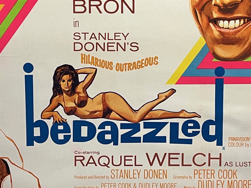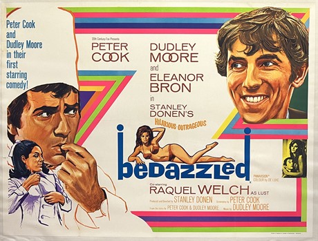 Scarce linen-backed UK Quad cinema poster for the Peter Cook-Dudley Moore comedy "Bedazzled" (1967) with poster illustration by Tom Chantrell.