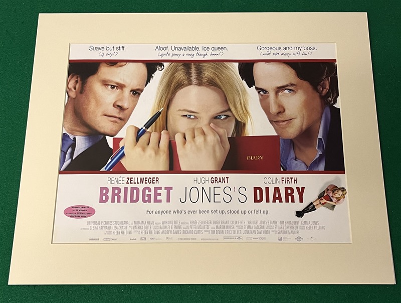 Original UK mini-Quad poster (12"x 16") card mounted (15 3/4"x 19 3/4") ready to frame for the rom-com starring Rene Zellwegger, Hugh Grant & Colin Firth, "Bridget Jones's Diary" (2001).