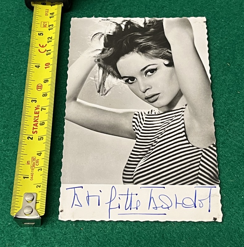 Autographed Brigitte Bardot French postcard (3 1/2"x 5 1/2") dating from the late 1950's, showing the French acrtress in a sultry pose.