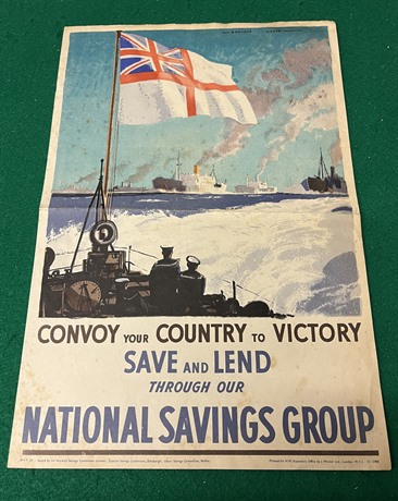 Small original WWII National Savings poster (10"x 15") entitled "Convoy, Country, Victory" (c' early 1940's) by artist Rowland Hilder.