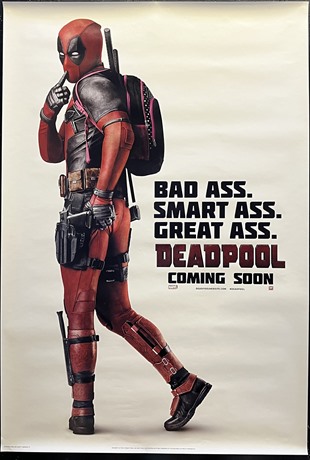The tongue-in-cheek poster reflects the comedic element that distinguishes the "Deadpool" Marvel Comics films from other scifi-superhero movies. This film distributed by 20th Century Fox.