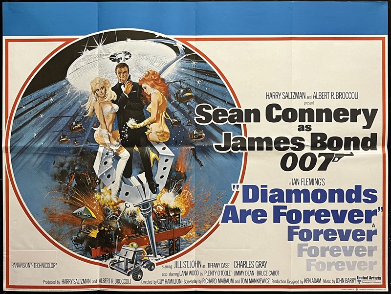 UK Quad cinema poster for the Sean Connery James Bond film "Diamonds Are Forever" (1971) with poster illustration by Robert McGinnis.A very popular Bond poster. McGinnis crams in lots of colour & action, explosions & beautiful girls too, Bond at the centre looking cool & classy (his orginal concept artwork had to be adjusted as the girl's hand holding the diamonds was deemed to be suggestively low).