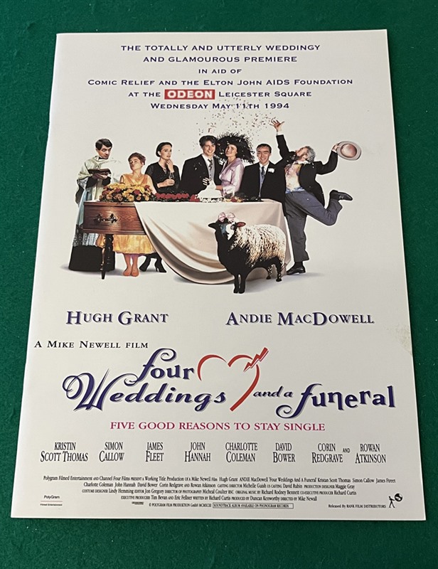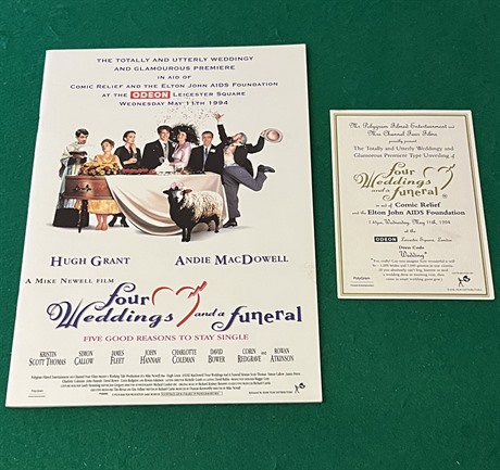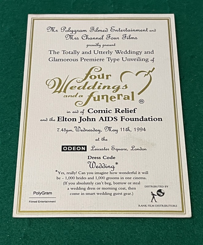 A Premiere card invitation (4 1/4"x 6 1/4") & programme for the British comedy "Four Weddings And A Funeral" (1994) which was held at the Odeon Leicester Square, 11th May 1994 (this a charity event supporting "Comic relief" & the "Elton John AIDS Foundation").