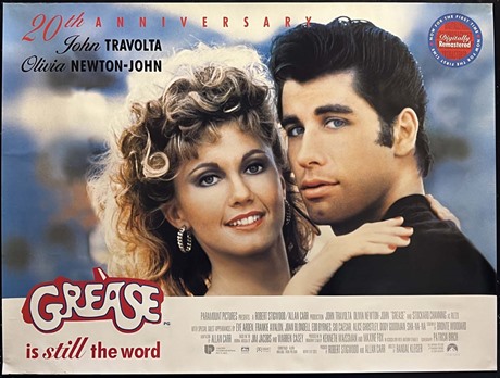 The poster reprises one of the two original '78 Quad designs, showing head shots of John Travolta & Olivia Newton-John.