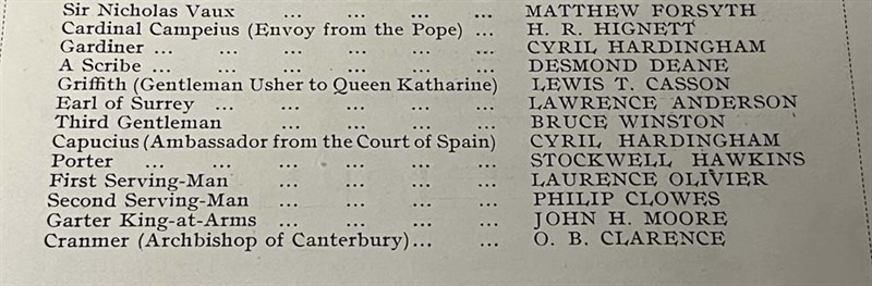 Olivier was invited to join Sybil Thorndike's company in 1925 as a bit-part player & assistant stage manager. Olivier can be found fourth from bottom of the male cast list playing the "First Serving-Man". We believe that this role was Olivier's first in the West End & aged only 18 this was right at the start of what would become a brilliant career on both the stage & screen!