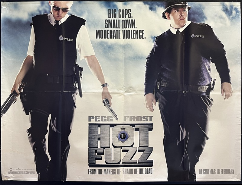 UK Quad Advance cinema poster for the second of the "Cornetto Trilogy" of films starring Simon Pegg & Nick Frost, "Hot Fuzz" (2007).