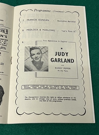 This was the first of three times Judy Garland was to star at the Palladium (she appeared again in 1964 & 1969). A rare early piece of Judy Garland UK memorabilia.