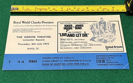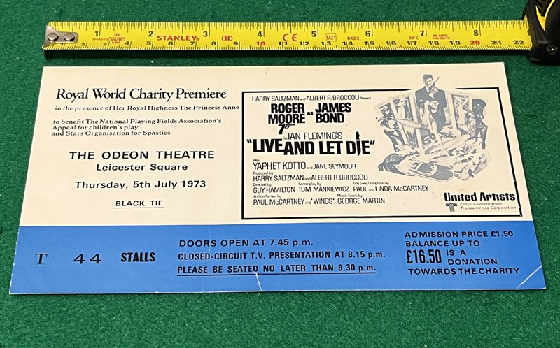 Large AUTOGRAPHED Premiere ticket (4 5/8"x 8 1/4") for the James Bond film "Live & Let Die" (1973) at the Odeon, Leicester Square, 5th July 1973.To the reverse are autographs of