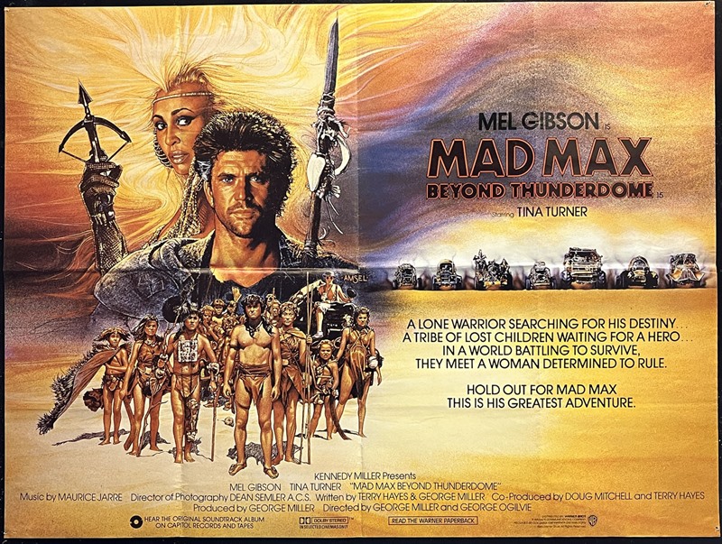 UK Quad cinema poster for the "Mad Max" sequel "Mad Max Beyond Thunderdome" (1985) with poster illustration by Richard Amsel.