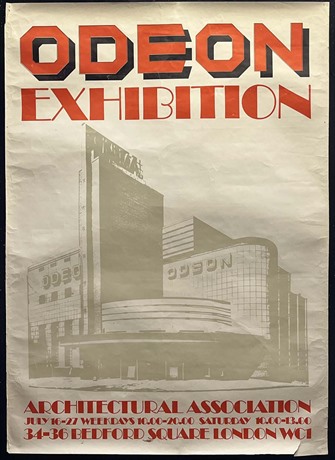 Fascinating piece of 20th century cinema memorabilia, an original poster (24"x 32 1/2") for an "Odeon Exhibition" staged at the Architectural Association, at their London HQ in Bedford Square, in July 1973.