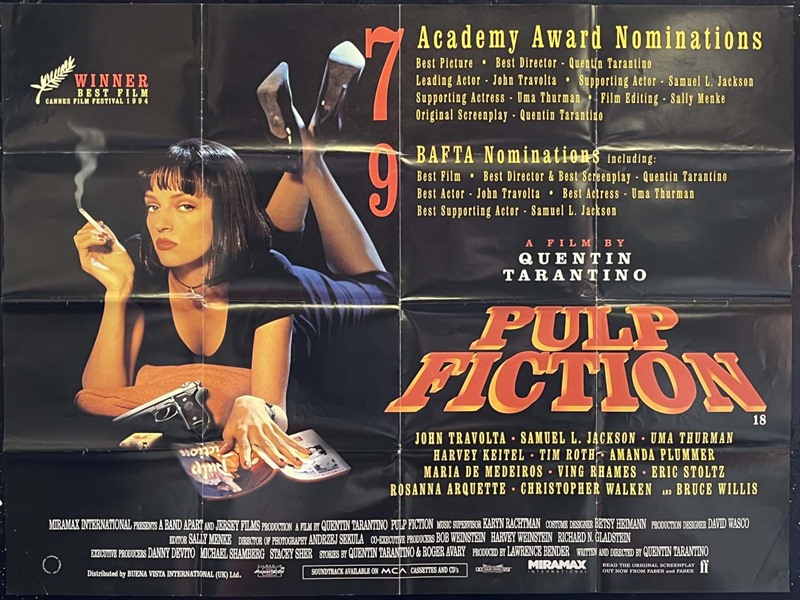 UK Quad cinema poster for the Quentin Tarantino film "Pulp Fiction" (1994) starring John Travolta & Uma Thurman.