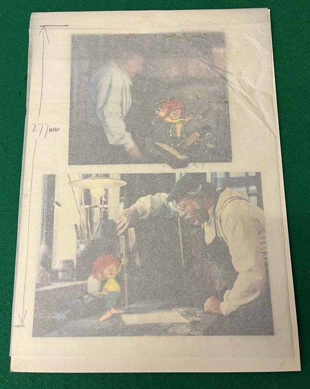 Meister Eder, upon which two painted cut-out figures of Pumuckl have been superimposed with other small paint work additions. A pencil annotated cover overlay is also in place.
