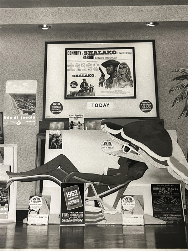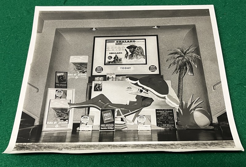 Original b/w photo (8"x 9") showing an in-house cinema display built around the Chantrell Quad poster for "Shalako" (1968).This photo was taken in a N.E. UK cinema. It was common in the 1950's-60's for cinema managers to mount such displays, often with associated tie-ups with local businesses (in this casre using "Shalako" to promote Humber Travel Agencies Spanish holidays).