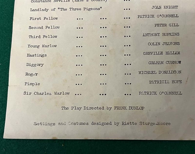 A fascinating two page "programme" for a touring production of "She Stoops To Conquer" (c' 1960-61) being of particular interest for being one of Anthony Hopkins first outings on stage.