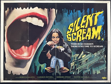 UK Quad cinema poster for the American slasher horror film "Silent Scream" (1979) with poster illustration by Tom Chantrell.