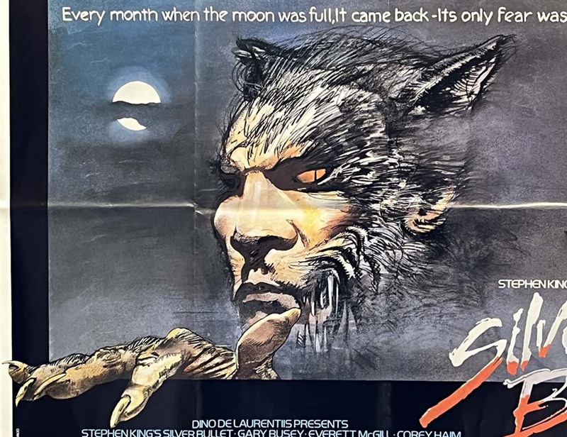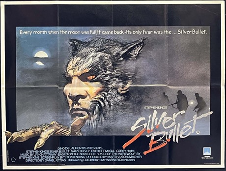 UK Quad cinema poster for the horror film based on the Stephen King story "Silver Bullet" (1985) with poster design/illustration by Vic Fair.