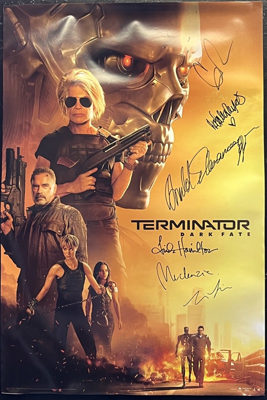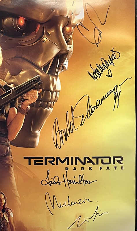 We believe this to have been a specially commissioned poster. Unlike the standard posters for cinema use, this poster is single, not double-sided. It has been boldly signed by the key cast members: Arnold Schwarzenegger, Linda Hamilton, Mackenzie Davis, Gabriel Luna, Natalia Reyes & Diego Boneta. This film distributed by 20th Century Fox & Paramount Studios.