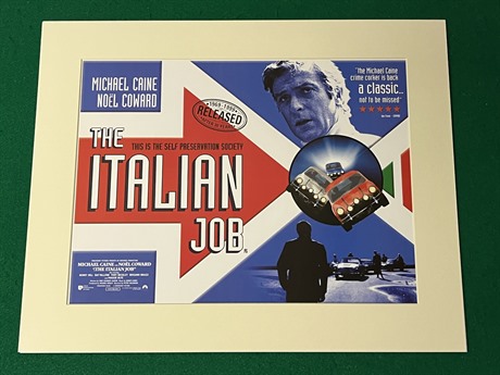 Original UK mini-Quad poster (12"x 16") card mounted (15 3/4"x 19 3/4") ready to frame for "The Italian Job" (1969), this being for the 1999 30th anniversary re-release. A modern poster design that packs a punch: the colours of the Union Jack & Italian flags, the Minis, 1960's "Mod" symbolism & Michael Caine too!