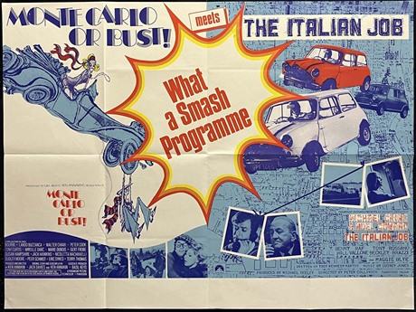 UK Quad cinema poster for the double-bill feature of "The Italian Job" (1969) & "To Monte Carlo or Bust" (1969), this c' 1971-72.