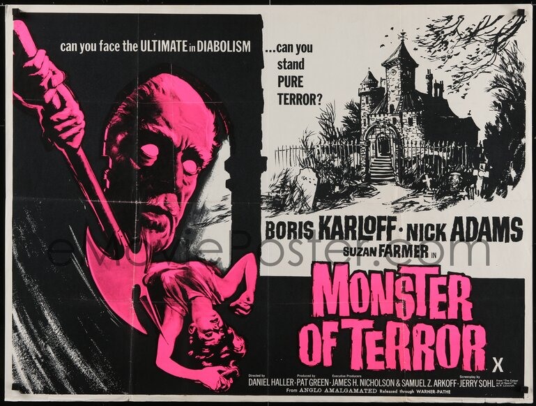 This is believed to be an early freelance work by Tom Chantrell. Chantrell would often use day-glo tinted colour images (as here) & almost certainly was responsible for the earlier stand-alone Quad for the first release of "Monster of Terror" (image attached courtesy of emovieposter for reference), this film starring Boris Karloff.
