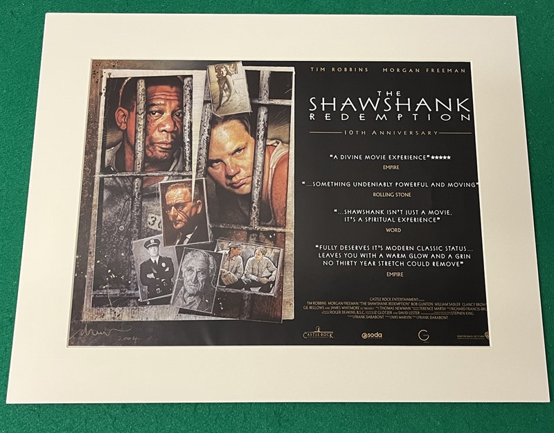 Original UK mini-Quad poster (12"x 16") card mounted (15 3/4"x 19 3/4") ready to frame, for the prison thriller "The Shawshank Redemption" (1994), this for the 10-year anniversary re-release with fabulous artwork by Drew Struzan.