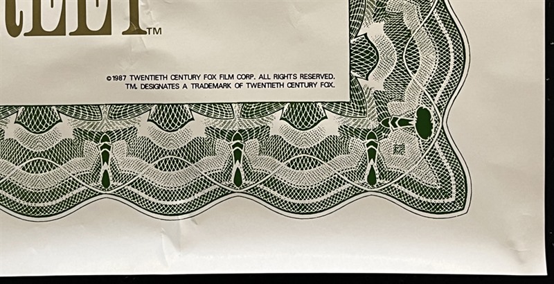 This poster was commissioned by 20th Century Fox & printed by "One Stop Posters". The poster is designed to lool like a certificate/bond, entitled "Greed" & carries a quote from the notorious Wall Street banker "Gordon Gecko". Sent to a select few by the Studio, this was part of Fox's pre-release publicity campaign. This poster came from an ex-20th Century Fox staffer who confrms that it was never designed for use in cinemas or sold to the public. A Letter of Authenticity to this effect will be included with the sale.
