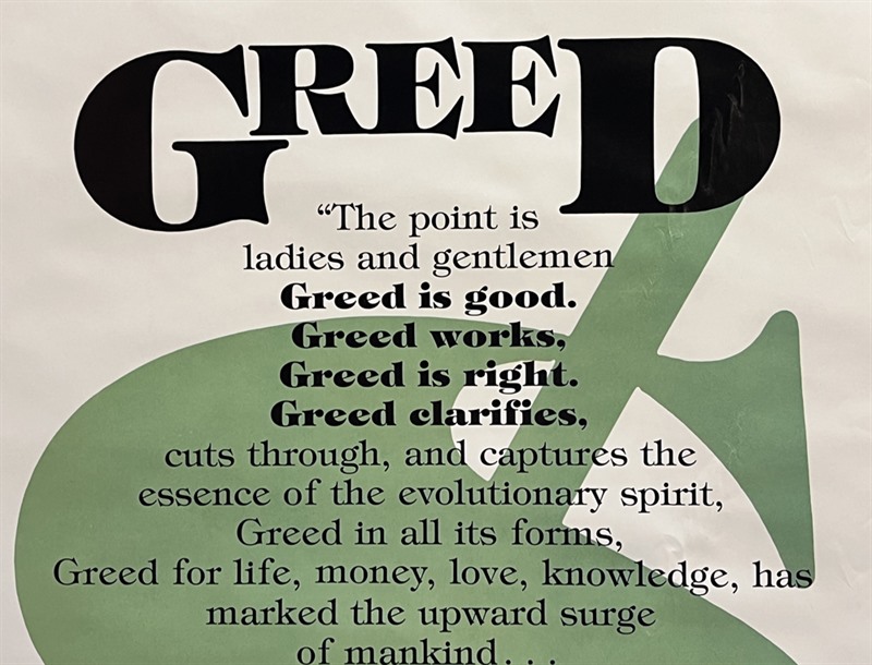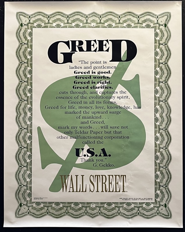Rare "Wall Street" (1987) specially commissioned poster (22"x 28") presented to a select number of industry insiders prior to the release of the film, the quote "Greed is Good" being one of the most famous of all from the world of 20th century movie.