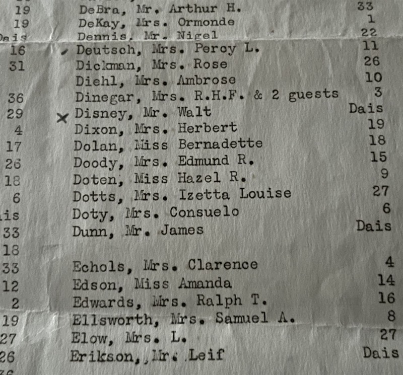 The seating plan runs alphabetically from "A" to "S" with various recognisable names from the movie industry of the time, including Mr Walt Disney. Befitting his status in the industry, Disney was seated on the "Dais".