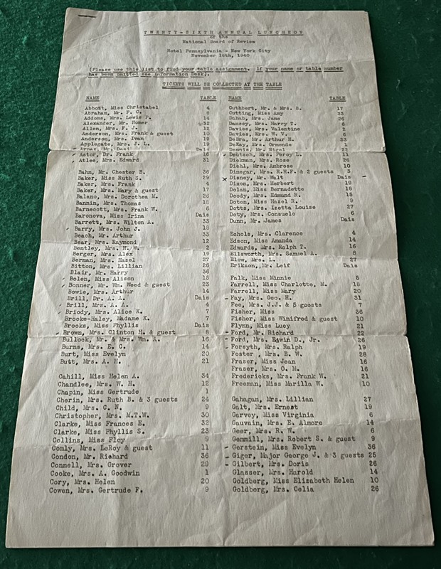 An interesting piece of vintage Hollywood memorabilia being a two-page table seating plan for the "Twenty-Sixth Annual Luncheon of the National Board of Review" at the Hotel Pennsylvania, New York City, 16th Nov 1940.