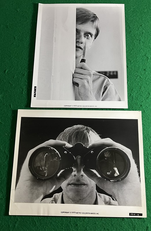 One is a particularly interesting still which has had b/w photos added to the glasses of the binoculars. This shot showing the slasher killer was pivotal in the movie & appears on the US 1-Sheet poster (image for reference courtesy of emovieposter). This particular still has been marked up on the reverse, clearly for further promotional/publication purposes. The second still has been similarly annotated to the reverse.